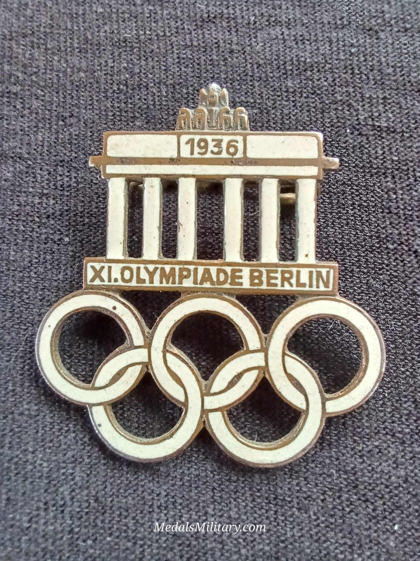 (XI. Olympiade Berlin Abzeichen). Constructed of bronze with enamels, horizontal pinback, maker marked on reverse “Hermann Aurich and Ges. Gesch.”, , in near extremely fine condition.