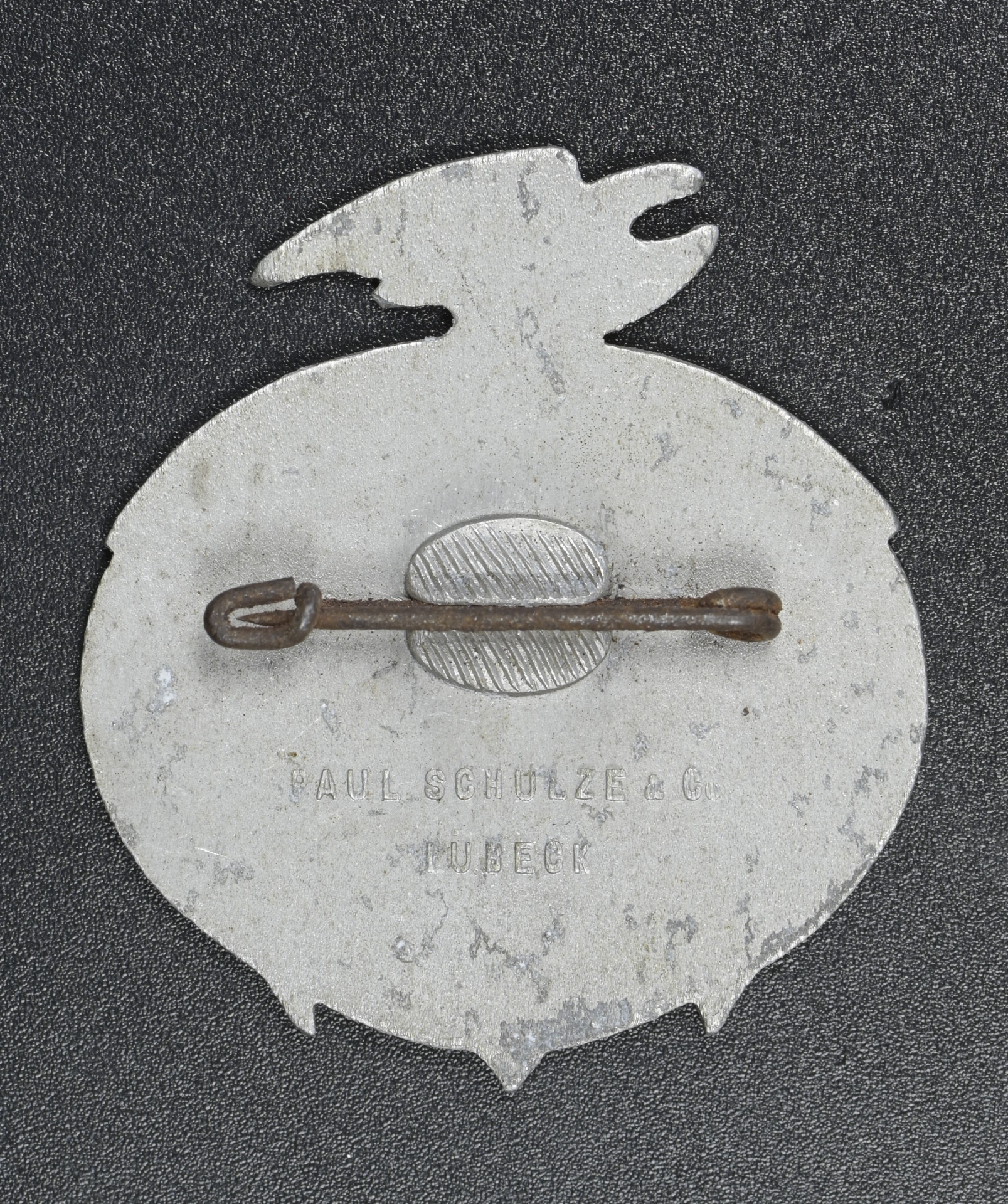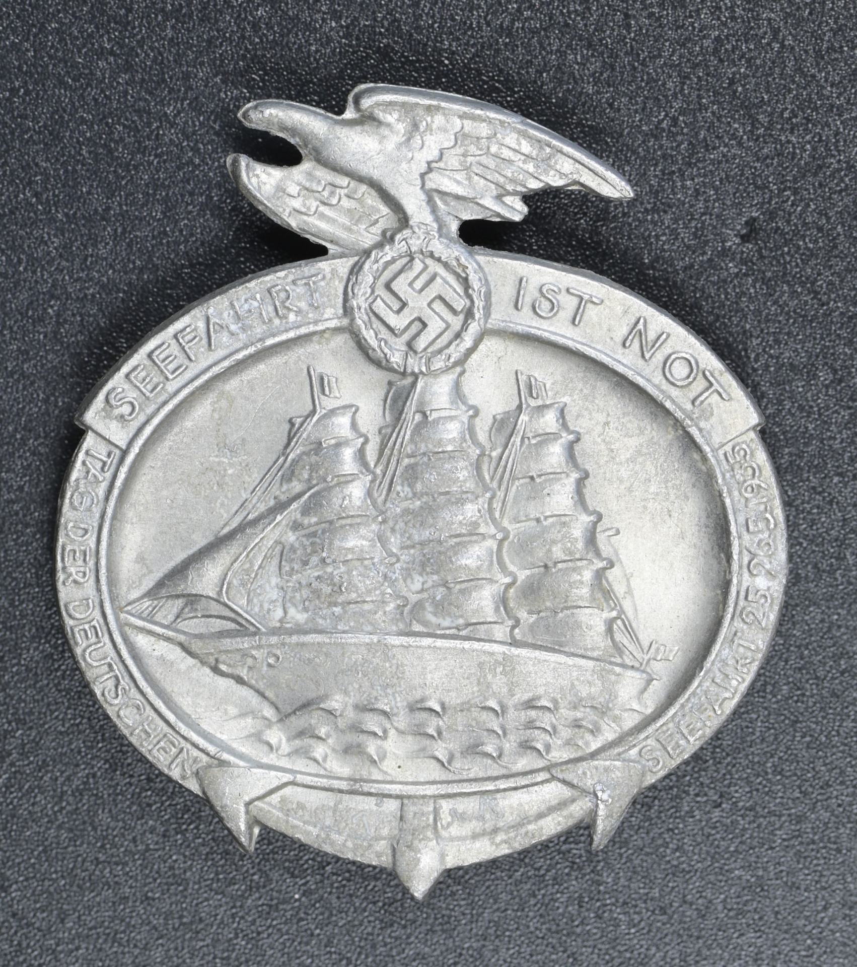 1935 Day of German Seafaring badge, constructed of aluminum, horizontal pinback, the reverse maker marked “PAUL SCHULZE & CO., LÜBECK”, measuring 42 mm (w) x 45 mm (h), in extremely fine condition.