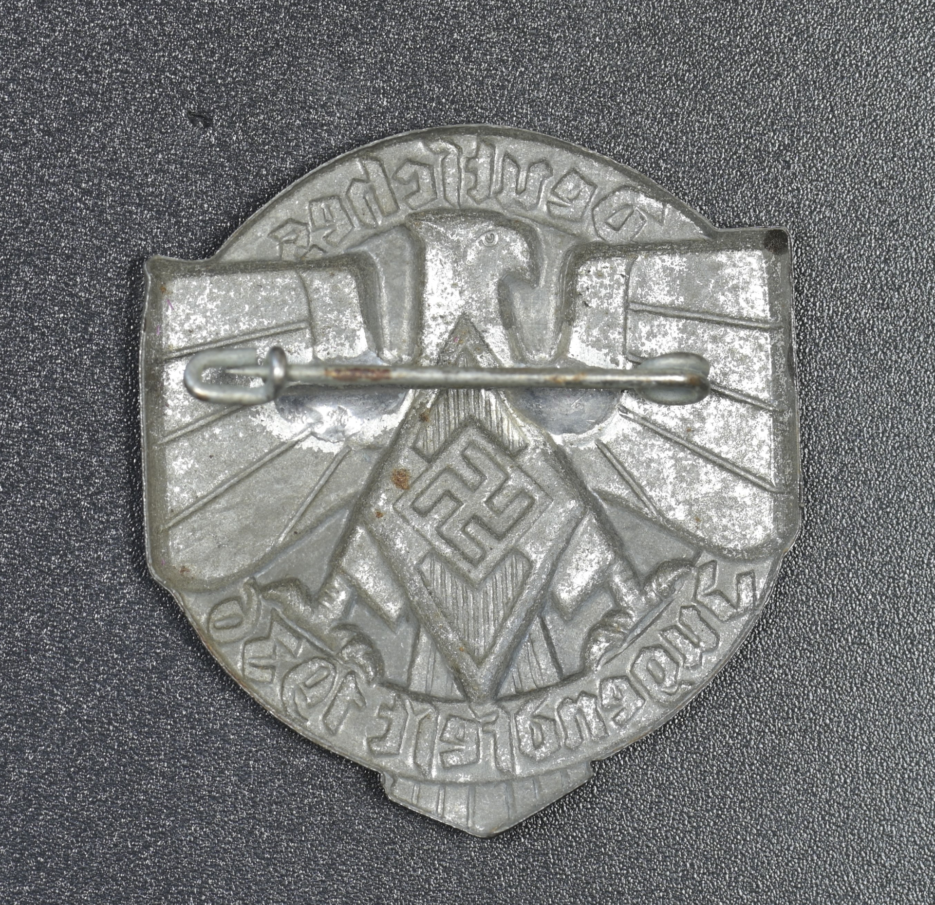 A 1936 HJ Deutsches Jugendfest badge; in bronzed and darkened metal (magnetic); horizontal pinback; unmarked; measuring 40 mm x 36 mm; extremely fine condition.