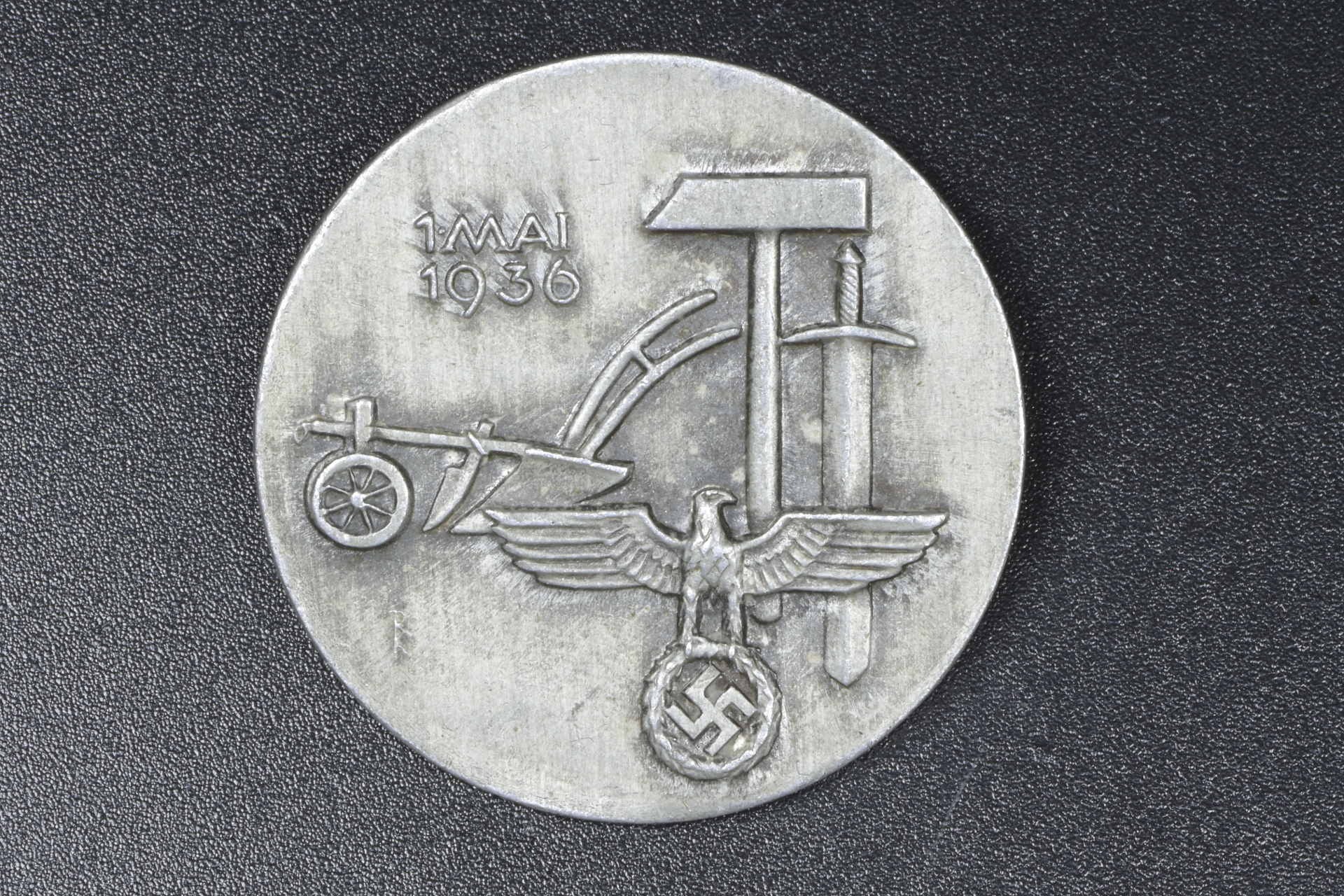 A Third Reich period “Tag der Arbeit” badge (May 1st, 1936); vertical pinback; maker marked on reverse.