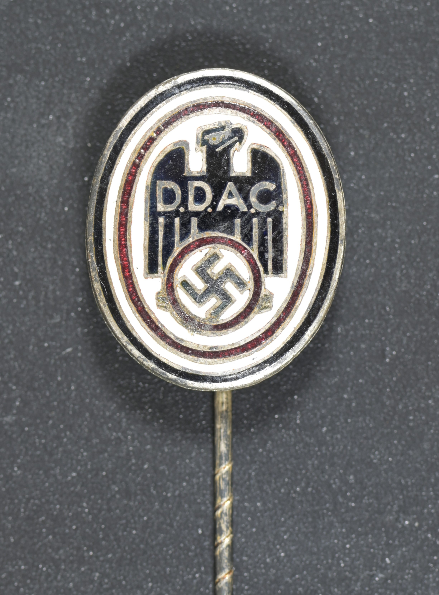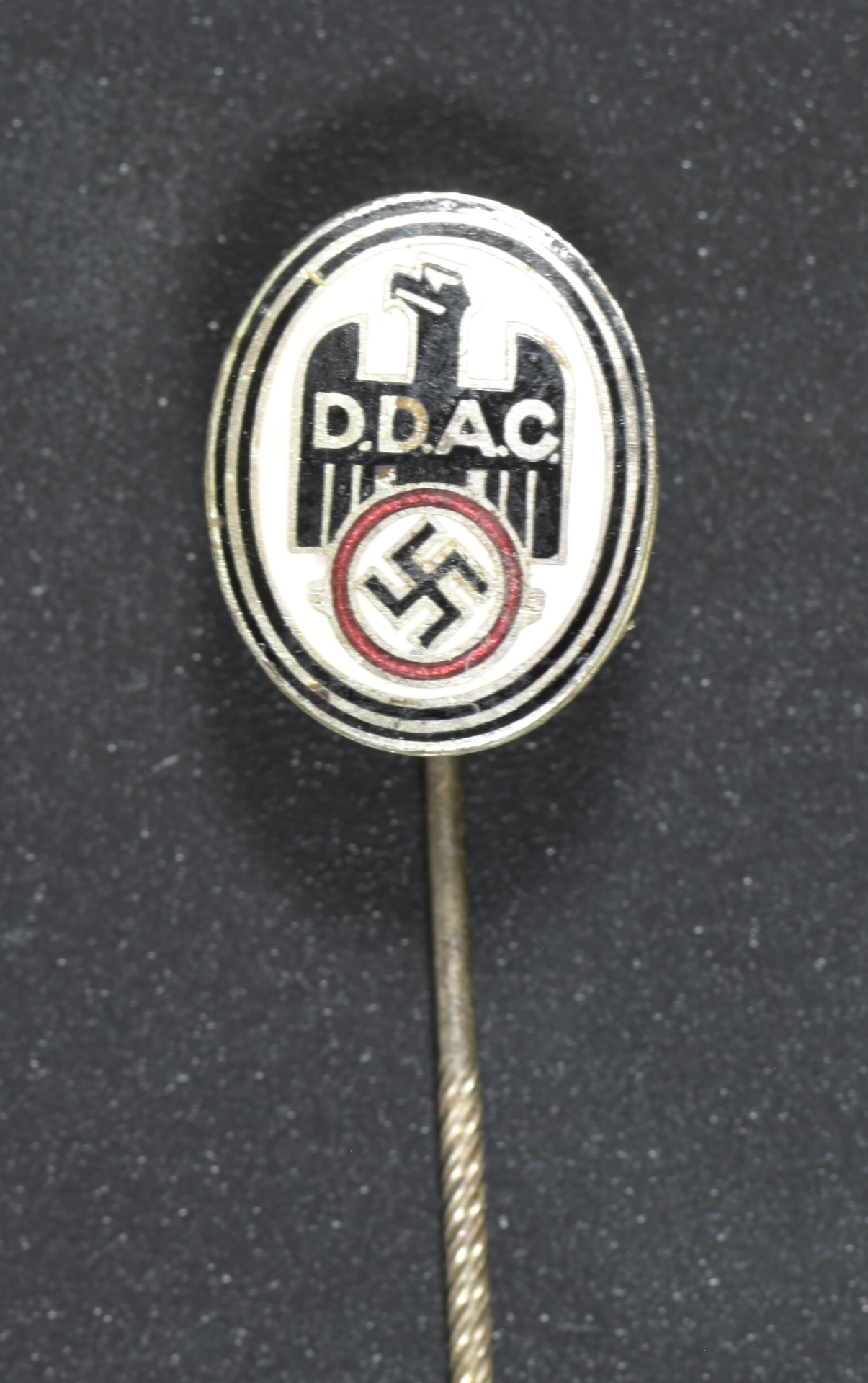 A grouping of three D.D.A.C (Der Deutsche Automobile Club/The German Automobile Club) membership stick pins; all in silvered bronze and fine quality red, black, and white enamels; better than very fine condition.