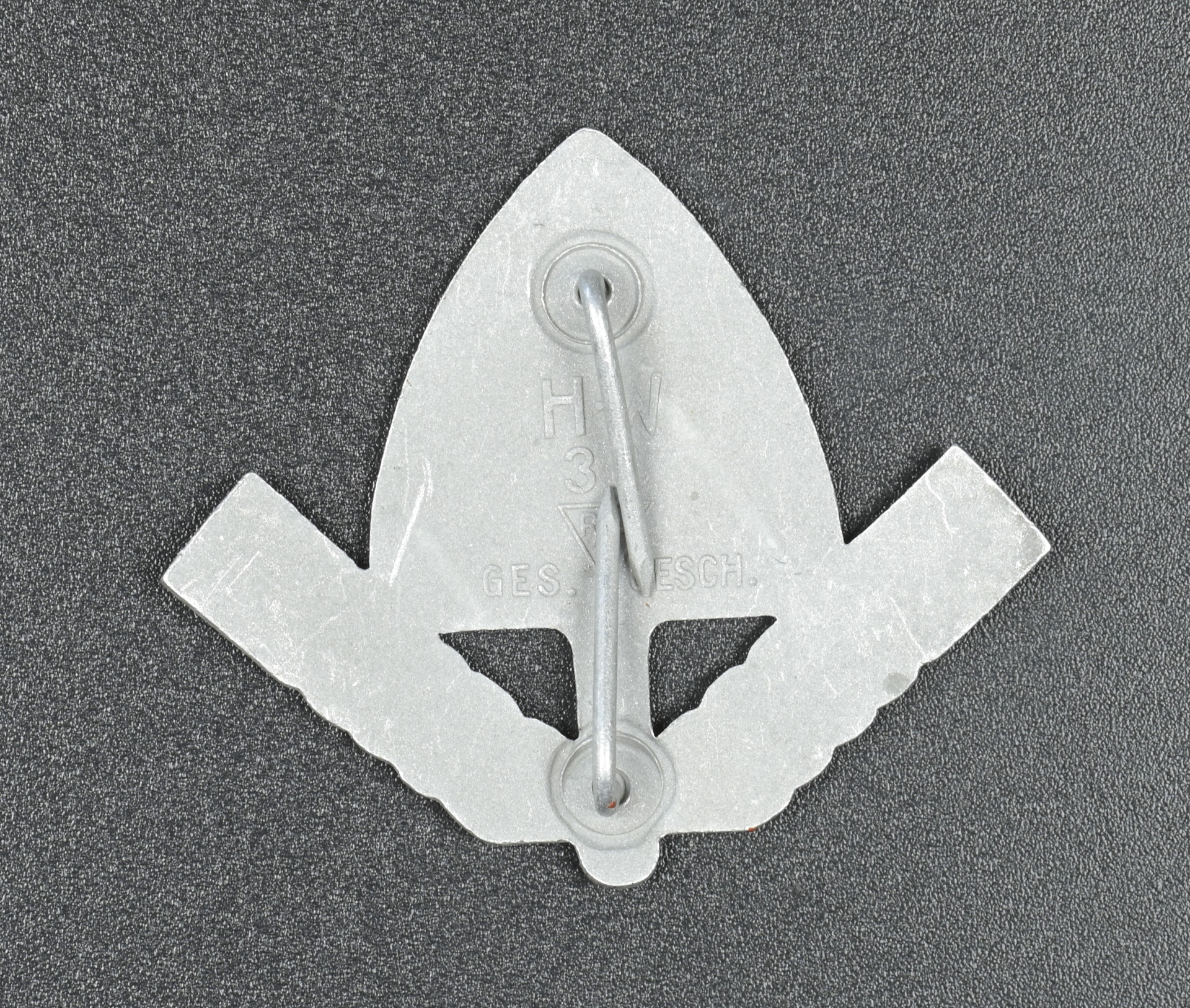 A RAD (Reichsarbeitsdienst/National Labour Service) cap badge; in stamped aluminum with a painted red shovel with a centred black mobile swastika; both prongs fully preserved and tightly crimped into place; maker marked “H.W 38 GES. GESCH. RADJ” on the reverse; overall very fine condition.