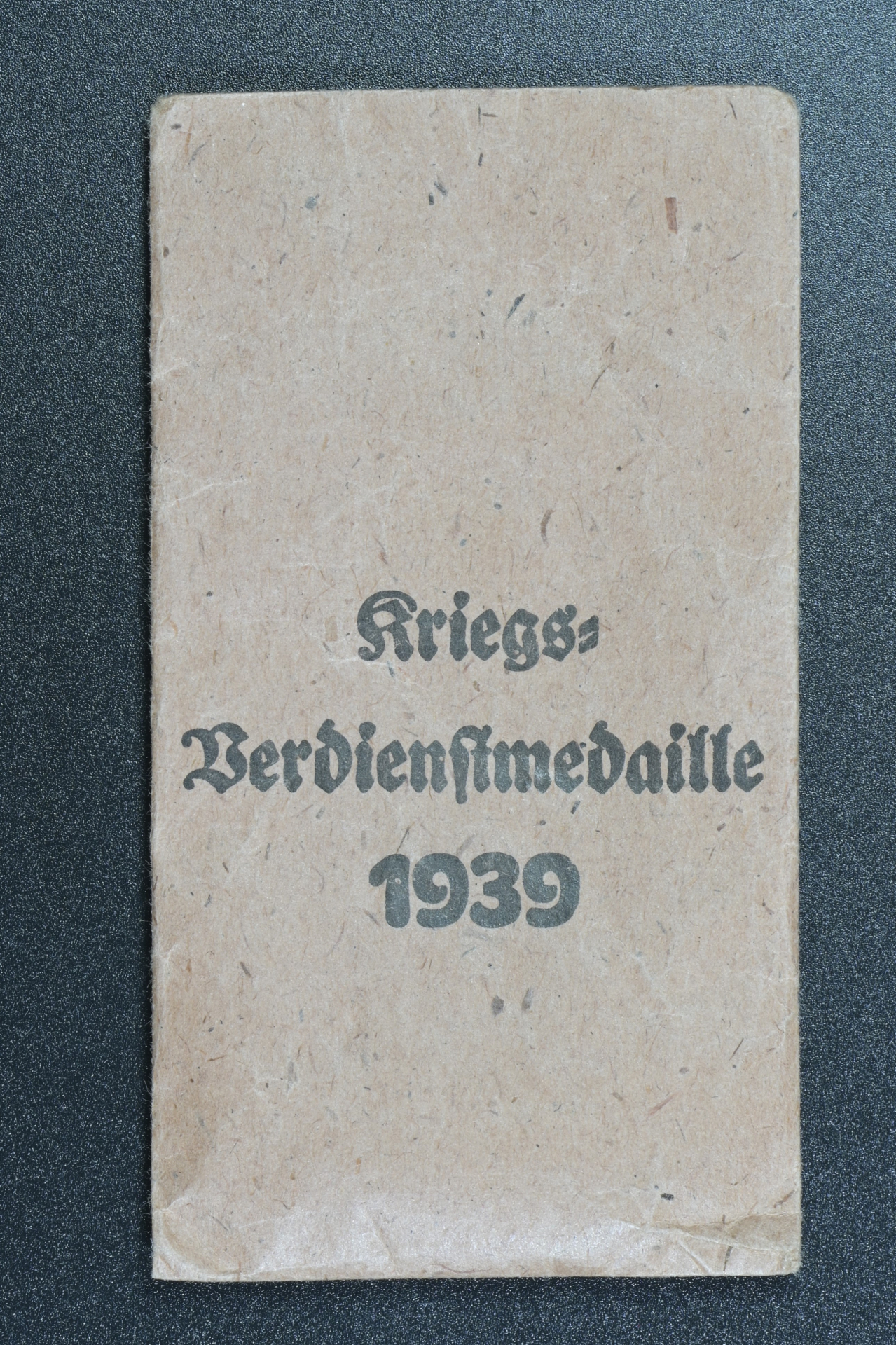 An extremely well preserved “Kriegsverdienstmedaille 1939”; in bronze; on loop for suspension; with its original ribbon; with its original paper packet; embossed with “Kriegsverdienstmedaille 1939” in black in on the obverse; embossed with the maker’s mark “Gottlieb Keck & Sohn, Pforzheim” on the reverse; near mint condition.