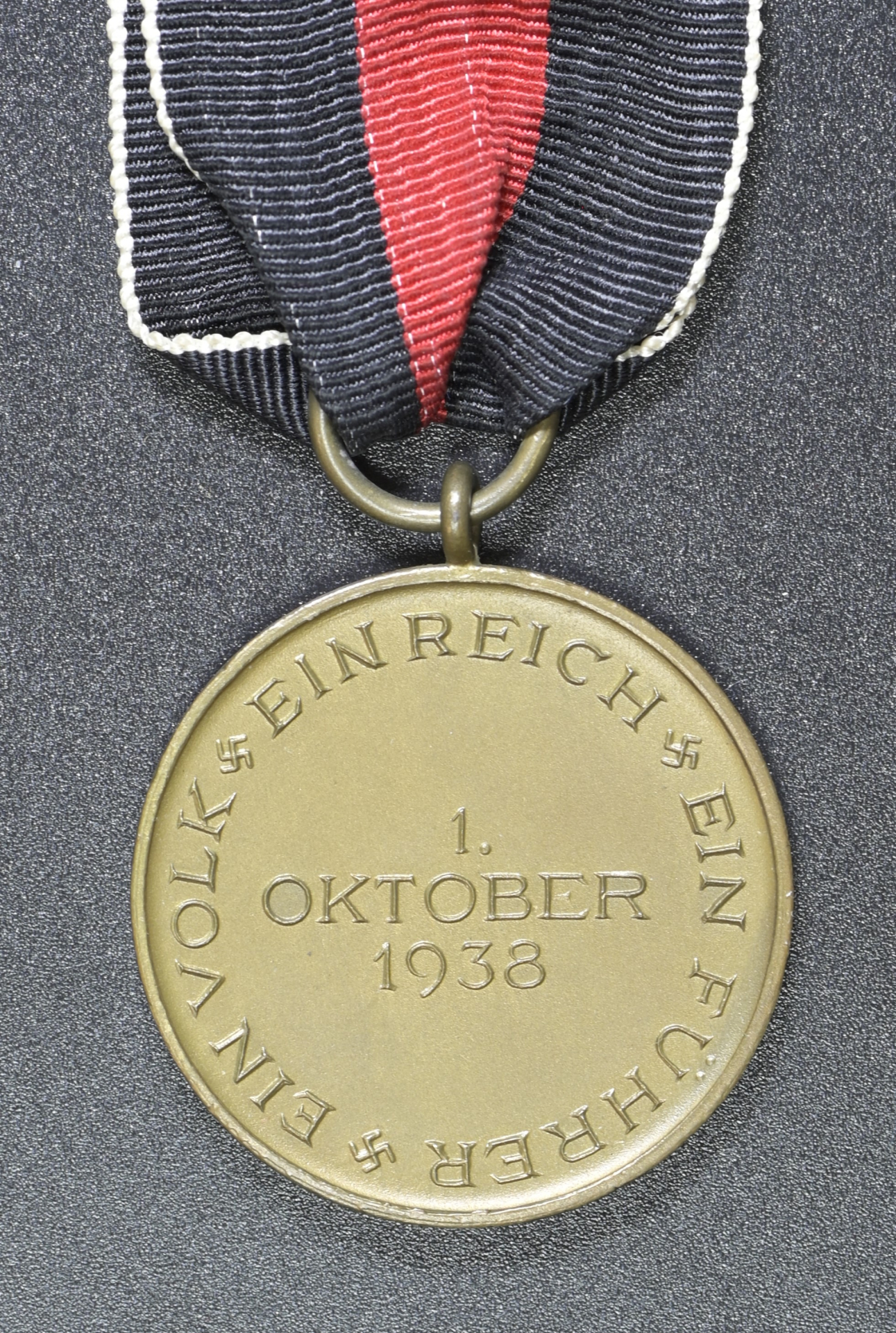 A “Medaille zur Erinnerung an den 1. October 1938”; circular bronze medal; with long ribbon; the obverse with two raised male figures, the one on the right bearing the German flag in his left hand, with his right hand placed around the shoulders of the figure on the left, with broken chains around his right arm (symbolic of the liberation of the Sudeten German from Czechoslovak oppression), with the German eagle directly below; the reverse with the date “1. Oktober 1938” centrally and circumscribed “Ein Volk, Ein Reich, Ein Führer” (One People, One Country, One Leader); measuring 31.71 mm in diameter; weighing 12.3 grams; near mint condition.