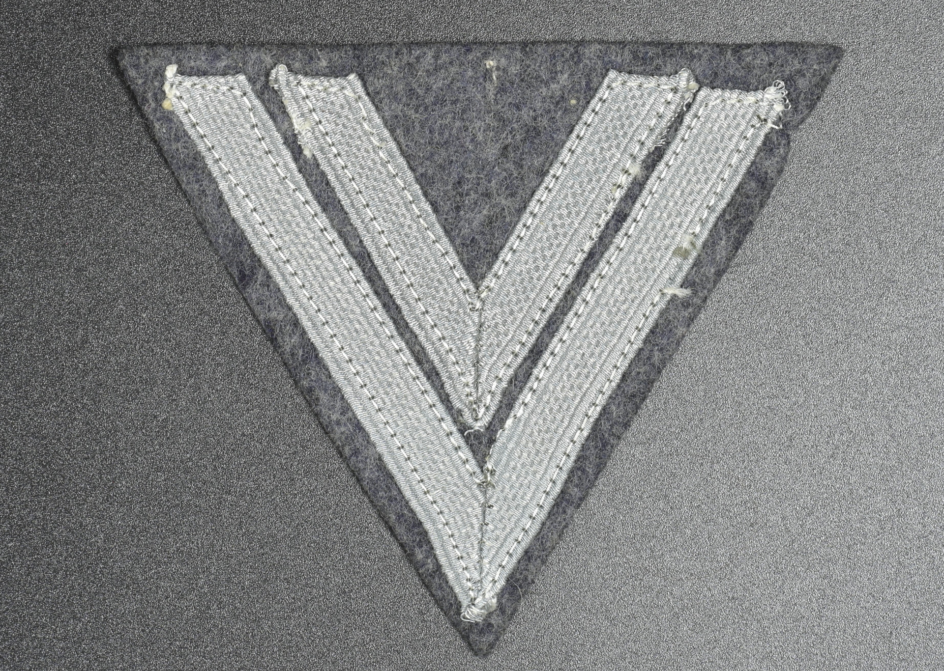(Heer Obergefreiter Ärmelwinkel). Constructed of field-grey wool, the obverse with dual machine-embroidered silver aluminum wire tresses, unmarked, measuring 93 mm (w) x 90 mm (h), in near extremely fine condition.