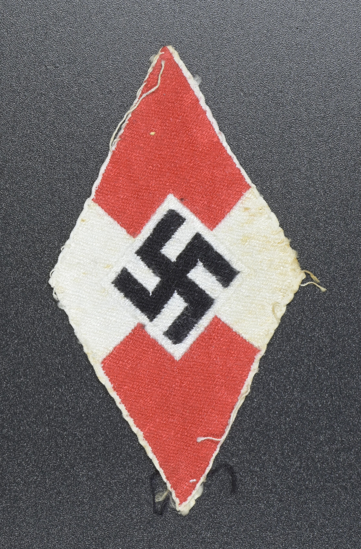 (HJ Ärmelabzeichen). Constructed of multi-coloured cotton embroidery, the obverse consisting of an HJ insignia in the form of a red and white checkered diamond bearing a central black mobile swastika, in uniform-removed and very nice condition.