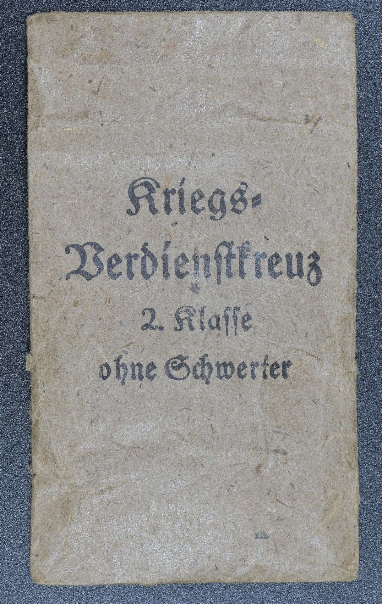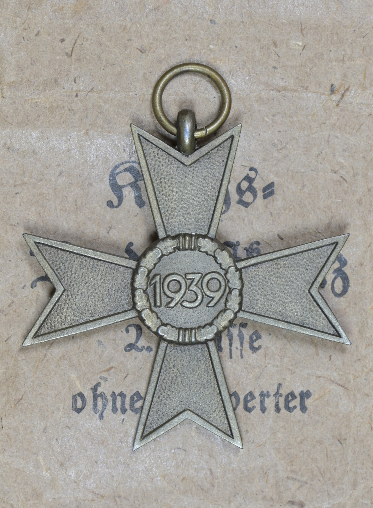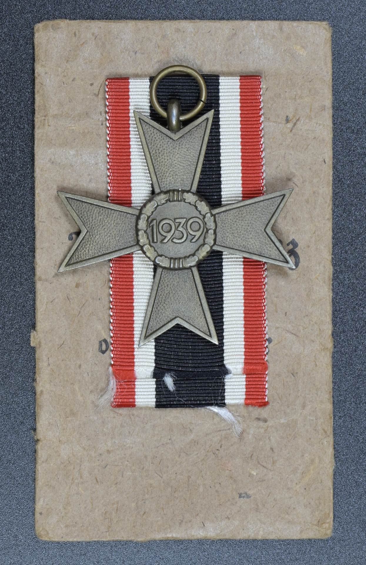 (Kriegsverdienstkreuz II. Klasse). Constructed of bronze, on loop for suspension from its period original ribbon, consisting of a Maltese Cross with pebbled arms, the obverse bearing a central wreathed mobile swastika, the reverse bearing a central wreathed date of “1939”, unmarked, accompanied by its package of issue, constructed of brown paper stock, the exterior bearing a maker’s mark of “Eugen Schmidthaussler, Pforzheim”, near mint condition.