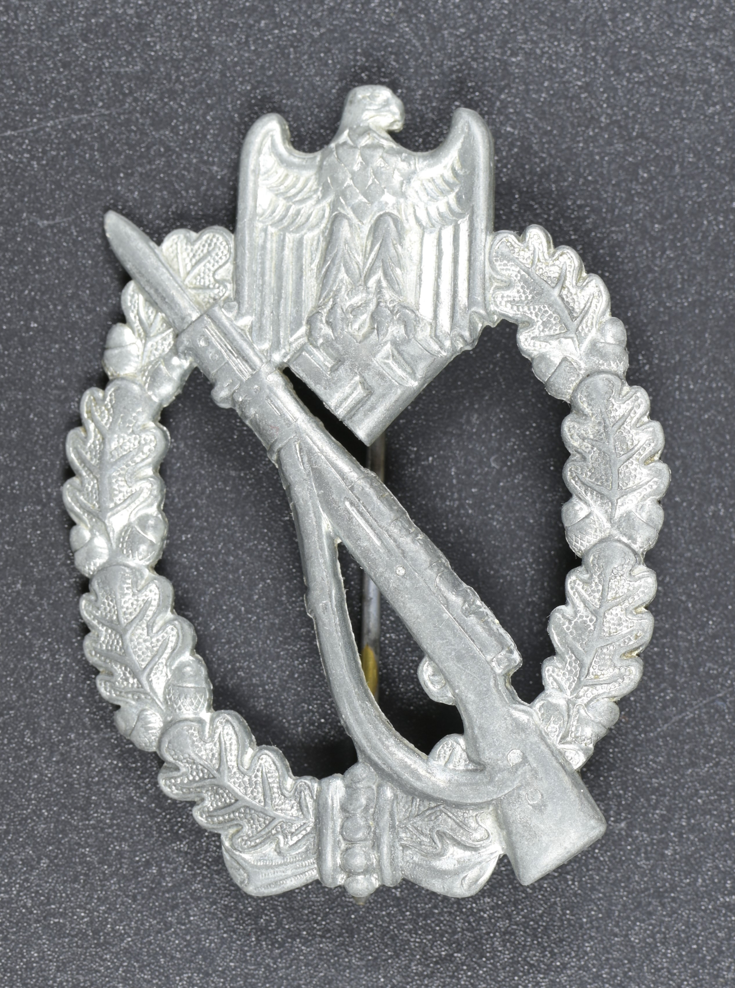 Here is a very nice condition and hard to find un maker marked example of a IAB from "Julius Bauer & Co ,Gablonz" This Silver grade Infantry assault badge.badge is high definition & zinc struck with silver wash.