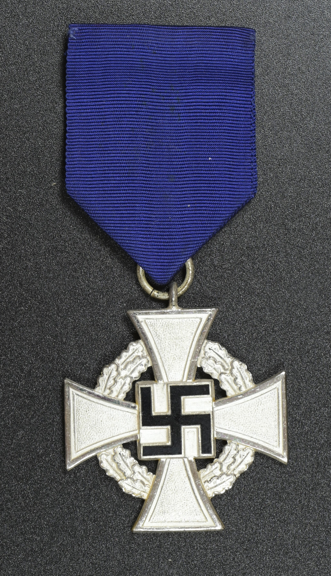 A Civil Service 25-Year Faithful Service Award, constructed of silvered bronze with enamels, on loop for suspension from its period original ribbon with horizontal pinback, consisting of a Cross Pattée with pebbled arms joined through the quadrants by a circular oak leaf wreath, the obverse bearing a central black enameled swastika, the reverse bearing a central raised inscription of “FÜR TREUE DIENSTE” (“FOR FAITHFUL SERVICE”), unmarked, accompanied by its original presentation case, of two-piece card stock construction with a faux maroon leather exterior liner, the lid bearing a silvered number “25” situated within a cogwheel, the interior with a maroon felt lid liner and medal bed, the former marker marked “JOS. RUCKER & SOHN, GABLONZ/NEIßE. SUD.”, in extremely fine condition.