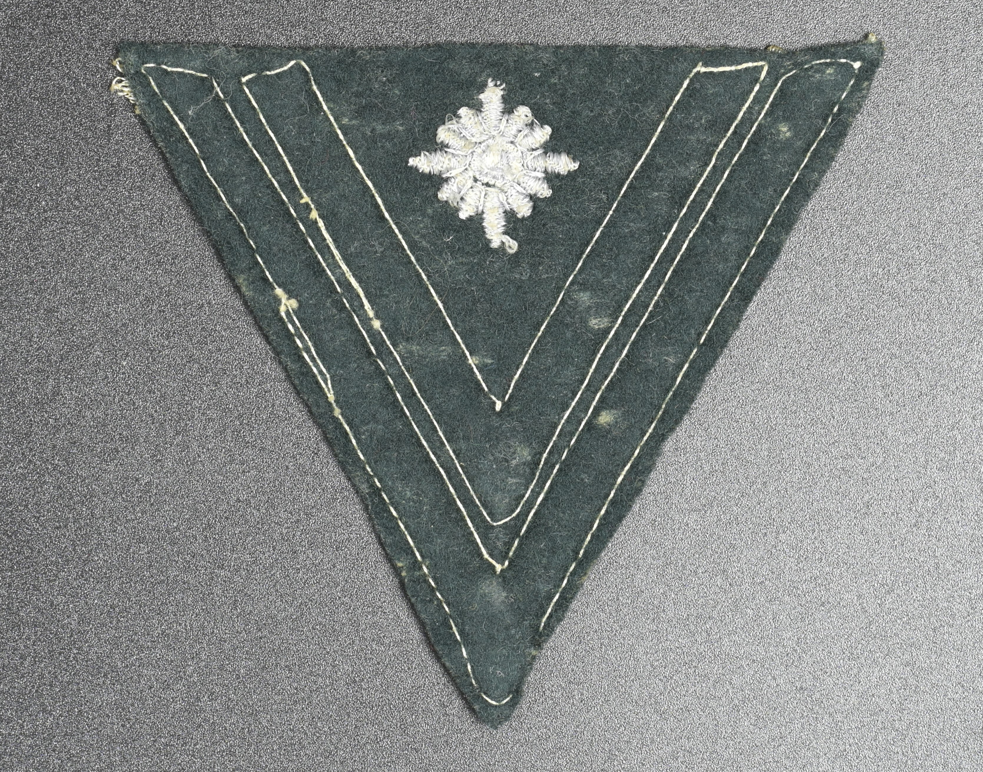 A Heer Stabsgefreiter insignia, constructed of black wool, the obverse bearing two silver-grey chevrons topped by a single machine-embroidered silver-grey pip, unmarked, measuring 85 mm (w) x 85 mm (h), and extremely fine condition.